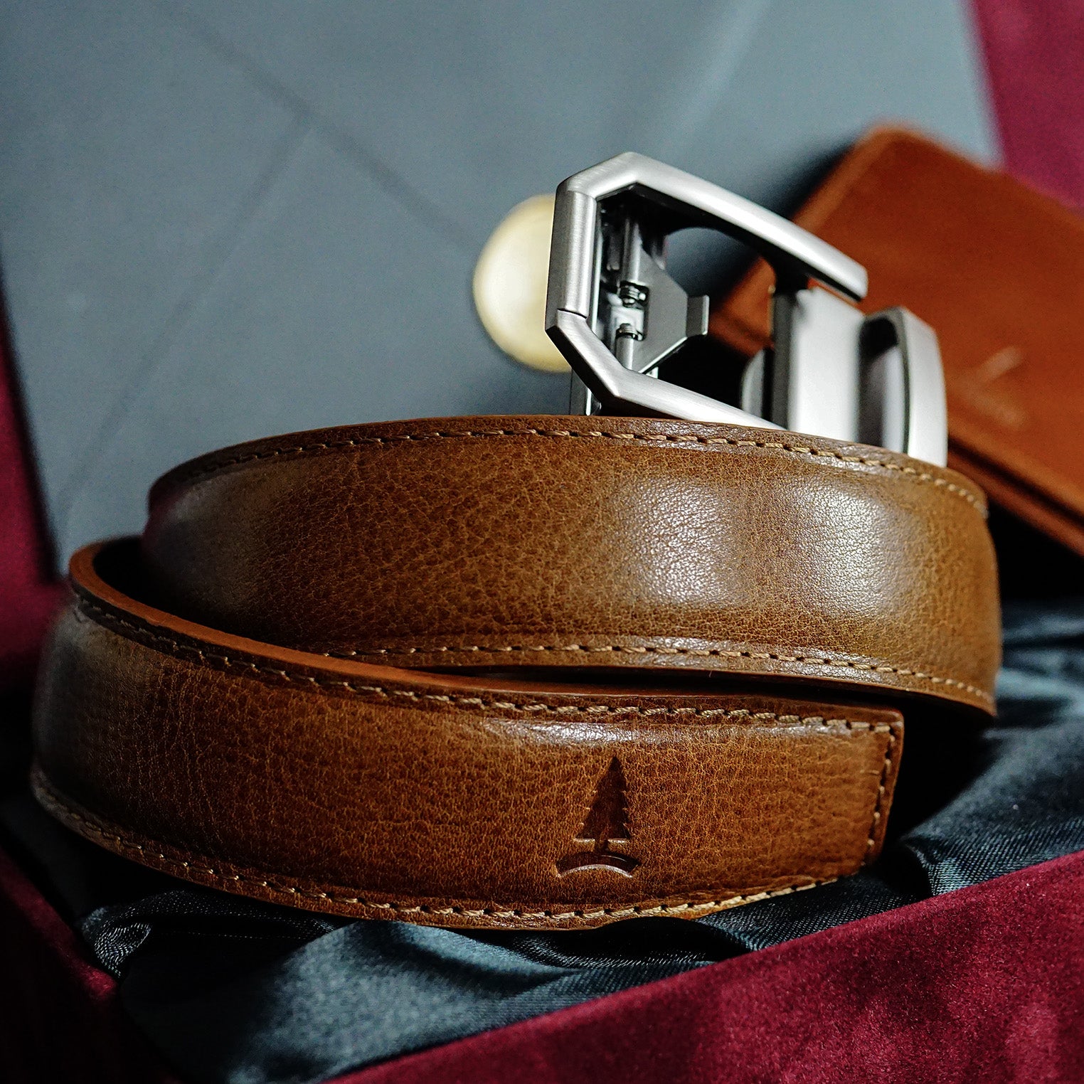Het monogram wordt op het uiteinde van de riem geplaatst